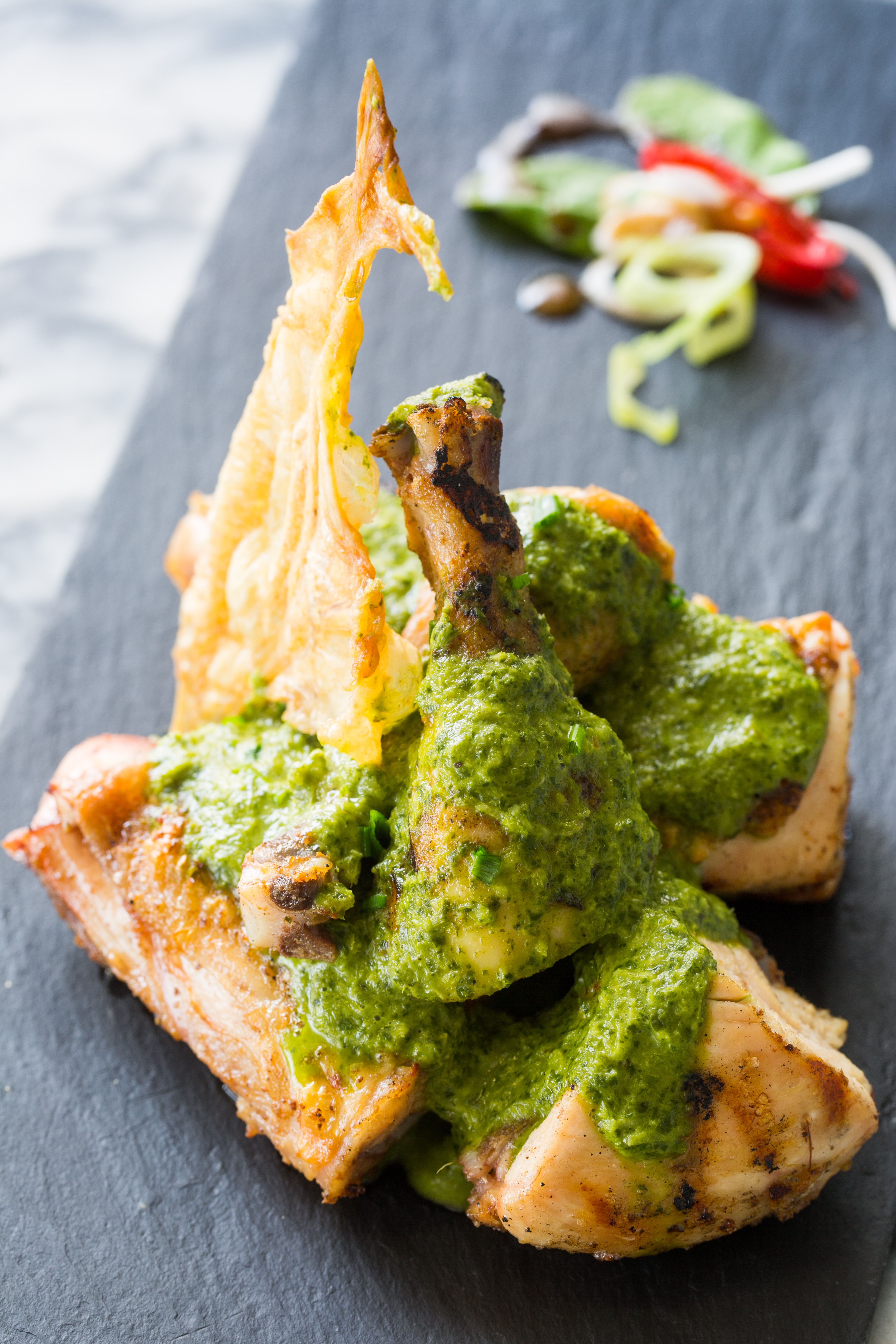O frango está presente em todos os pratos de forma reinventada, despretensiosa mas simultaneamente, com paladares arrojados, onde a criatividade transforma o simples frango assado numa proposta divertida e com temperos de todo o mundo, em saladas, sandes ou simplesmente assado com acompanhamentos inusitados.