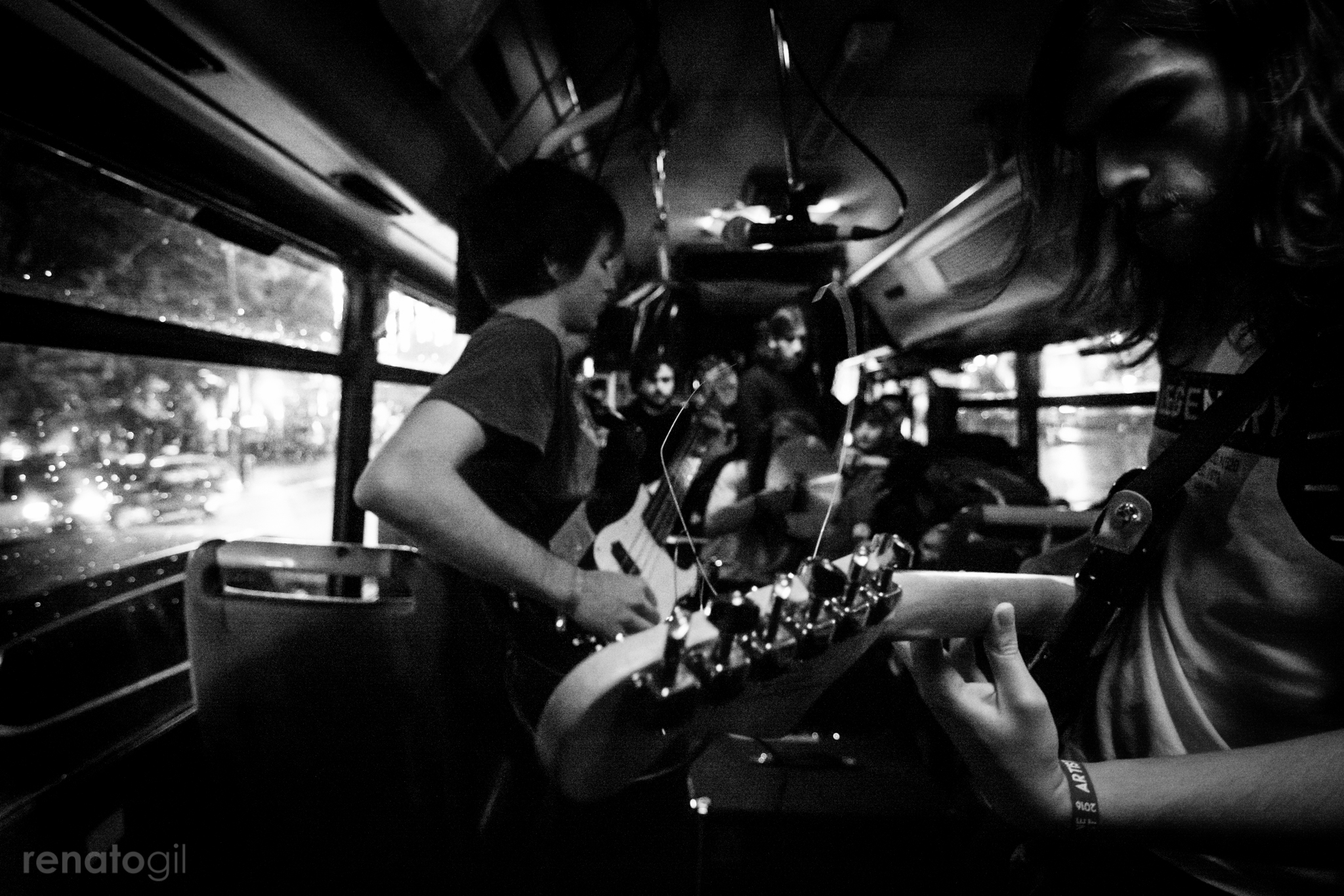 Deixámos o Tivoli e decidimos que estava na hora de experimentar o Vodafone Bus. Lá dentro, os 800 Gondomar com um rock cru de guitarra, bateria e baixo faziam o autocarro abanar em festa.